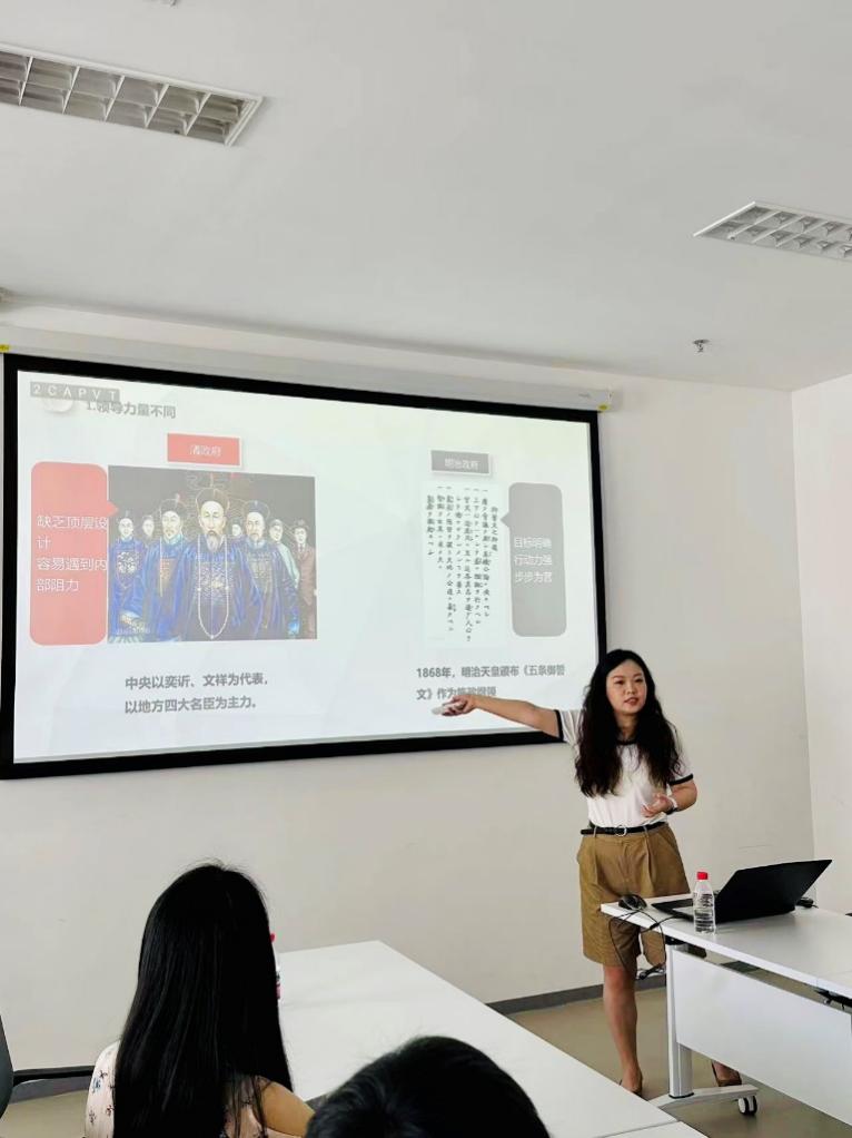赵紫玉以晚清政府的洋务运动和日本明治维新为主体,从历史背景、改革举措、深层原因和最终结果等维度进行了深入对比,指出洋务运动以“中体西用”为指导思想企图实现王朝自救,而日本明治维新以更彻底、更全面的变革姿态走上资本主义发展道路,二者在目标、主体、举措上的种种差异导致了两场自强实验一胜一败。与会人员积极发言讨论,分享学习心得,并从甲午海战中的历史细节、日本社会的当前危机以及人工智能的未来发展等角度进行了延伸讨论。
