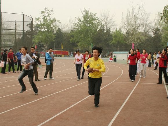 有趣的抱球跑迎面接力获第二名(黄色衣为机关队)