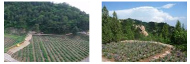 沿45度坡步行了700米进入中心观景区,又是一惊。闯入眼帘的是一遍青青的草,绿绿的树,宛延的小路漫在一座座山包中,脚下盛开着的小花,旁边一簇簇地薰衣草,再往平台上走到山边观景台时,更见两山之间一拢一拢的薰衣草整齐地排列在园中,花农们草帽和上衣的艳丽星星点点地点缀在绿色的园中……。